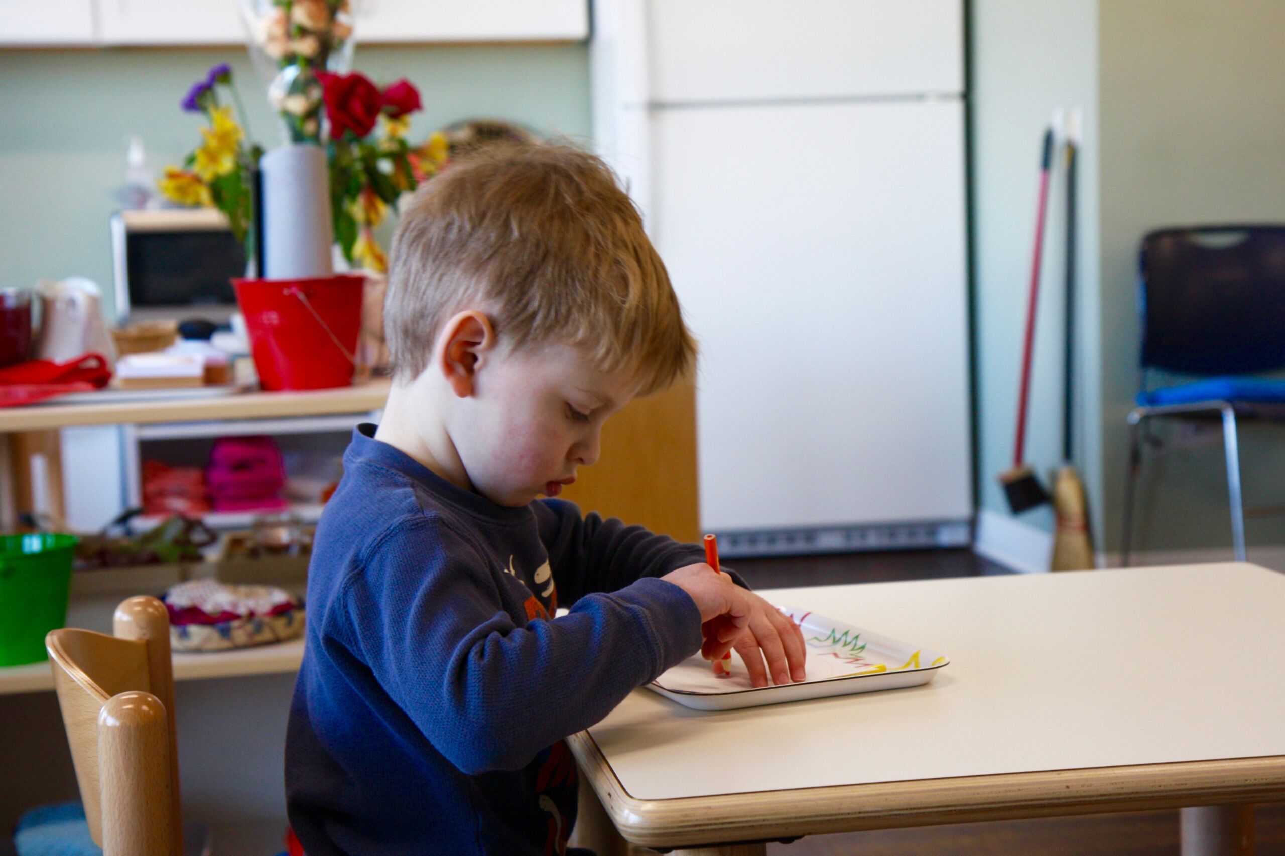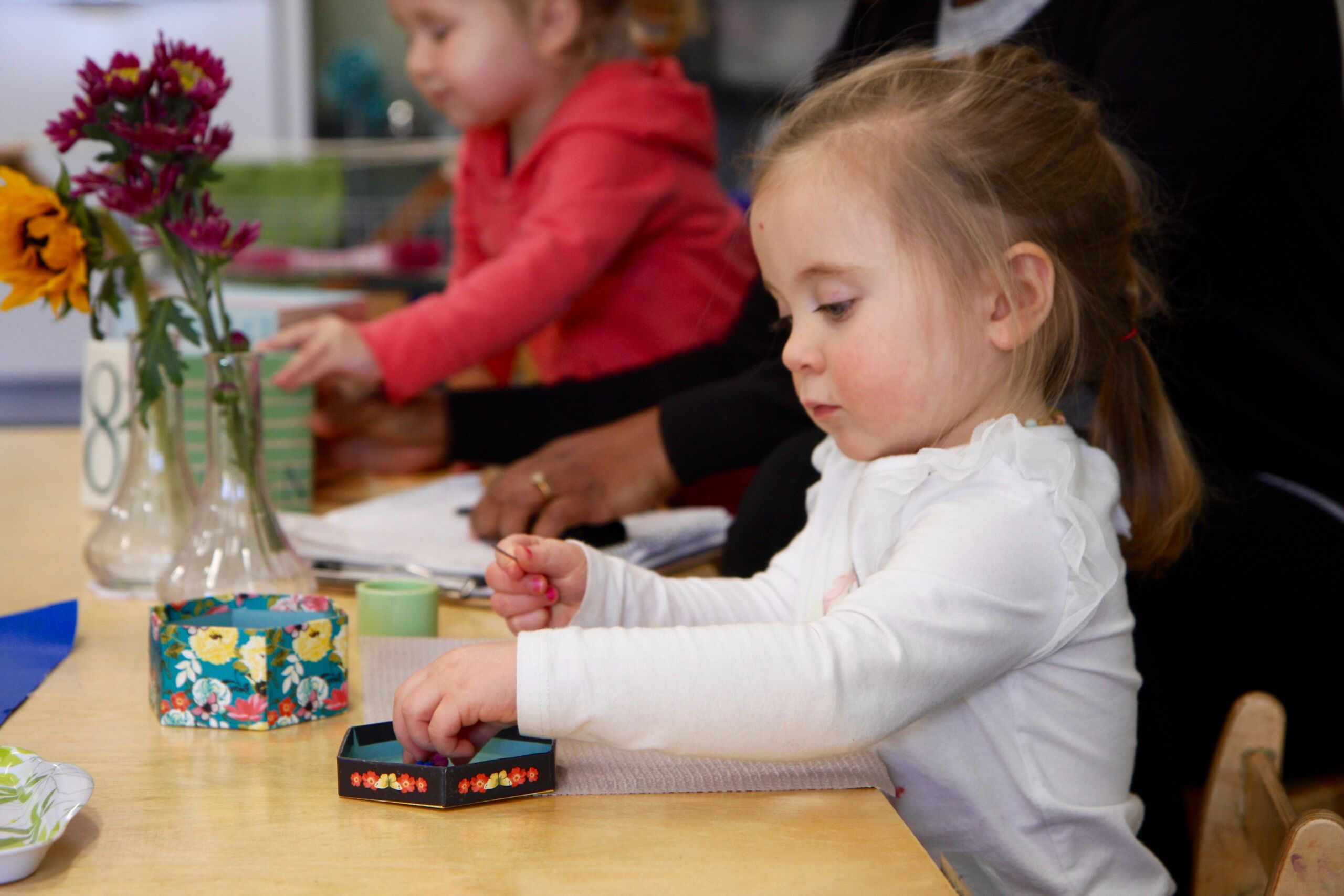 A toddler classroom has relatively few children, no more than nine children with two teachers. The space is prepared for the children to move around safely while they do activities focused around self-care and care of the environment as well as language enrichment. There are activities available indoors and out for toddlers to experience gross motor exercises. While the focus of the early years is personal independence, toddlers take time in group activities and there is a lot attention placed on grace and courtesy in interactions. The toddler class also has a consistent schedule that they do not stray from if they can help it, as the children need this in order to feel comfortable from day to day.